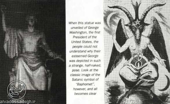و در سمت چپ مجسمه نیم لخت واشنگتن در بنای یادبود خود که بسیار شبیه بافومت ساخته شده است.روی بازو دست راست آن مثلث رو به پایین و زیر بغل آن مثلث رو به بالا را می سازد.روی دوپای آن نیز تک چشم وجود دارد که جلوی همان ماری به عصایی پیچیده و امروزه نشان بهداشت جهانی است،به حالت هرند هند در هر دو دست مشخص و با دست چپ انگشت شست را باز کرده که به اشاره به آلت تناسلی مرد است،شیطان پرستان و ماسونها نیز آنرا رعایت می کنند.به ستاره پنج پر روی سر این بز نیز توجه کنید.ضمنا ماه سیاه در سمت راست و ماه سفید در سمت چپ نشان تعادل می باشد