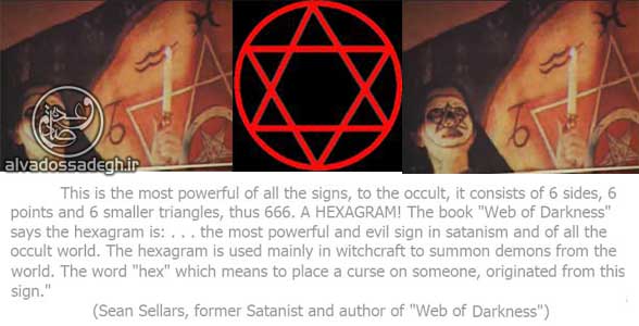 در اینجا تصویری که از سایت شیطان پرستان گرفته شده،بر این عقیده اند که این ستاره ای بسیار قوی است و با شش زاویه،شش مثلث کوچک و شش ضلع تشکیل شده و معرف 666( ابجد کلمه شیطان است)است.